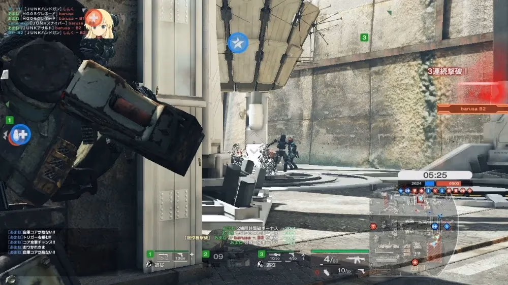 アサルトでのプレイではガンガンプレイ禁物、僚機を先行させて後ろからの攻撃で5連続キルを達成、なれてくると僚機には指示をだして自機は違う動きをした方がいい結果がでた。